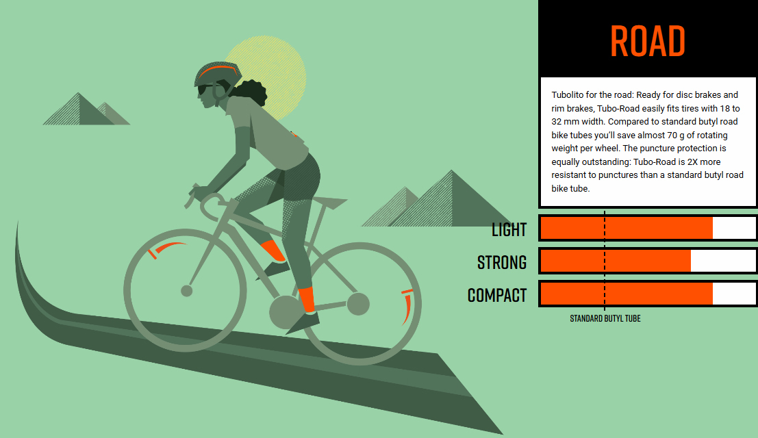 | Description | Road: Tubolito for the road: Ready for disc brakes and rim brakes Tubo-Road easily fits tires with 18 to 32mm width. Compared to standard butyl road bike tubes you'll save almost 70g of rotating weight per wheel. The puncture protection is equally outstanding: Tubo-Road is 2x more resistant to punctures than a standard butyl road bike tube. Sebastian Mechanic at Ceratizit-WNT UCI's Women´s Continental Team: "Tubolito is a huge contribution to our weight saving efforts." Tubo: Super robust and extremely lightweight for everyday use Road Summary