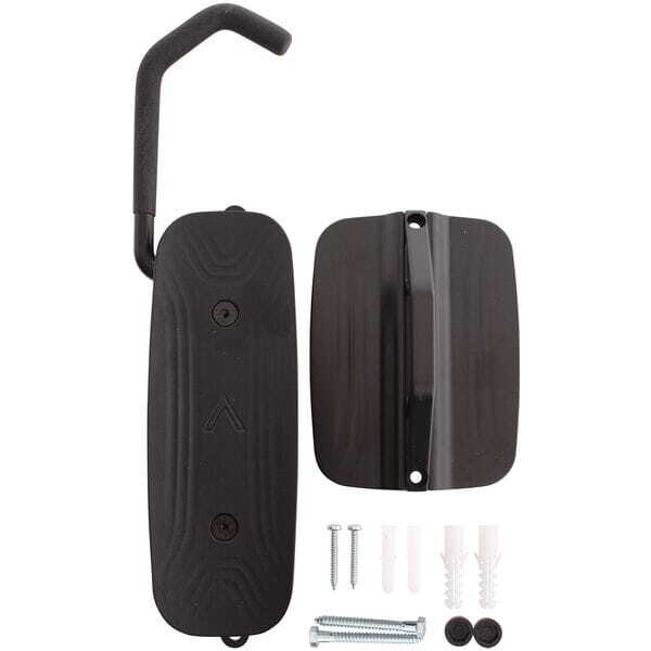 - Hook is mounted on a hinge and can be rotated +65 to -85 degrees, allowing bicycles to be stored close to the wall