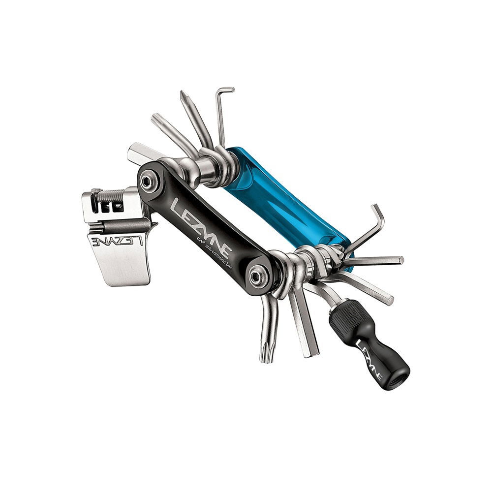 | Description | The Lezyne Rap CO2 tool is a simple ingenious tool with an integrated CO2 dispenser. The RAP CO2 line of multi tools feature a simple yet ingenious design that integrates a CO2 dispenser. The CO2 head quickly slides on or off the 5 mm bit allowing for easy access and an internal sleeve unthreads from the chuck revealing the engagement port for a threaded CO2 cartridge. The head threads onto either a Presta or Schraeder valve and is made up of a lightweight and durable aluminium construction. Available in a 15- or 21-tool build the RAP CO2 features our exclusive CRV+ corrosion resistant bits and ergonomic aluminium side plates. WEIGHT: 149g DIMENSIONS: 51W x 67L x 27H (mm) TOOL BITS: Hex 2, 3, 4, 5, 6, 8mm Chain Breaker: (9/10/11 speed) Star Shaped T25, T30 Spoke Wrenches: Mavic Mtv, 3.22, 3.45 Phillips-Head Integrated CO2 Dispenser |