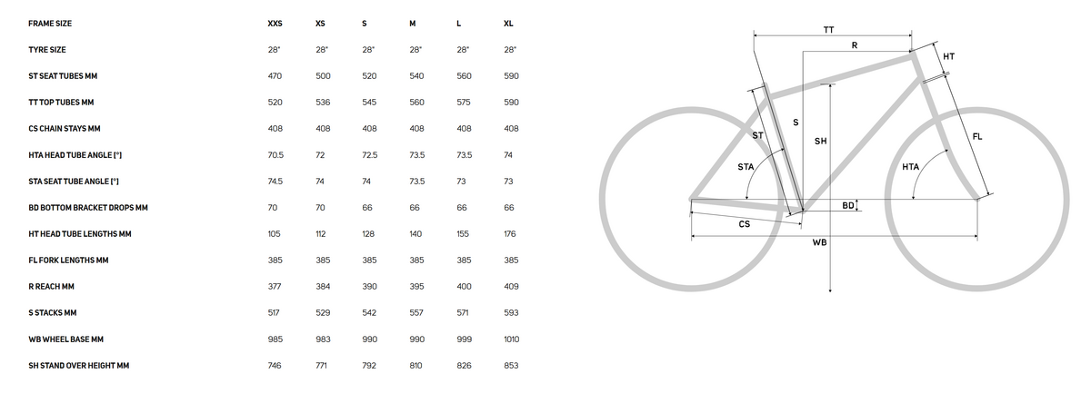 | Chainset | Shimano 105 R7100; 52-36 tooth chainset; Crank length: XXXS - 160mm, (XXS-XS) - 165mm, (S-M) - 170mm, (L-XL) - 172.5mm |